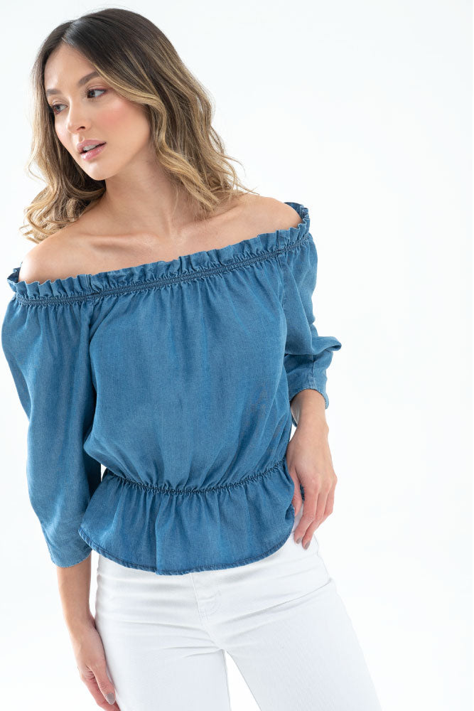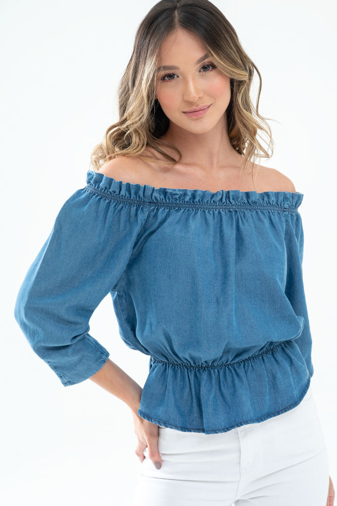Blusa en denim 100% tencel, escote malibu con elastico y ruche, manga 3/4, recogido en cintura con bolero decorativo.