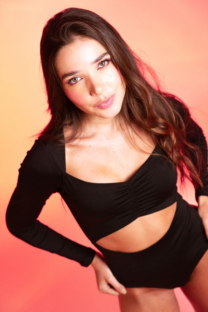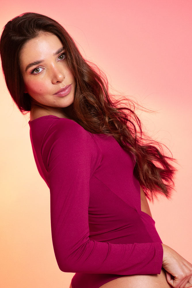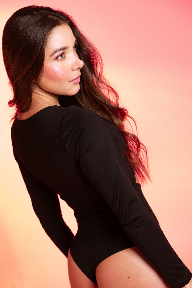 Body en tejido de punto penelope, escote en V con recogido con elástico de 0.5mm, abertura en abdomen, manga larga, ajusta con broches en la parte inferior de la tanga, silueta ajustada.