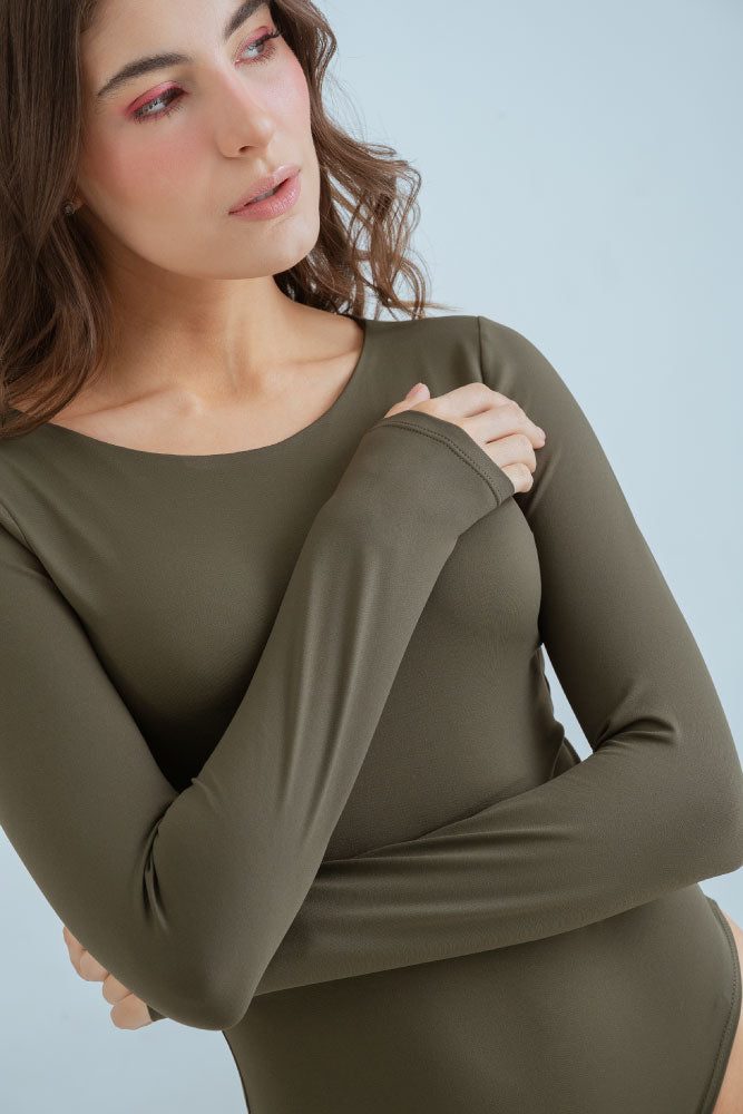 Body en penelope, escote redondo, con escote en espalda, manga larga.