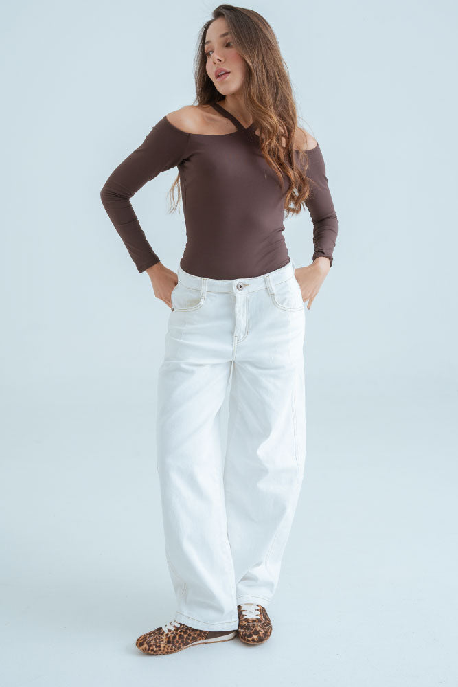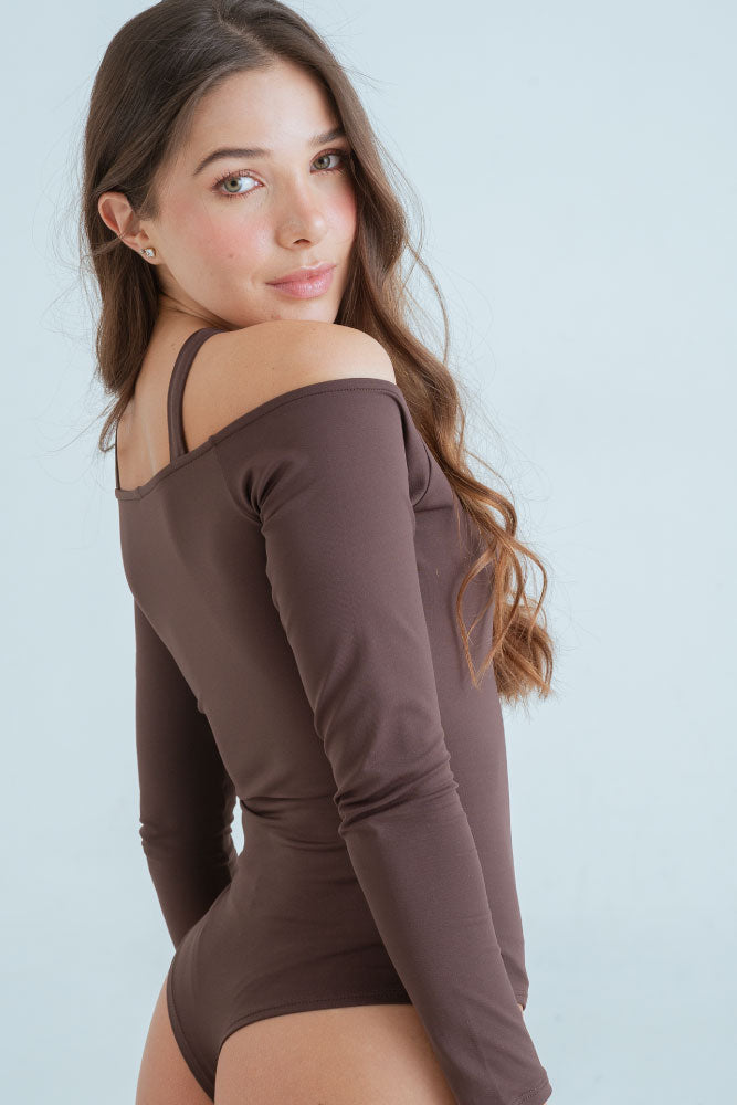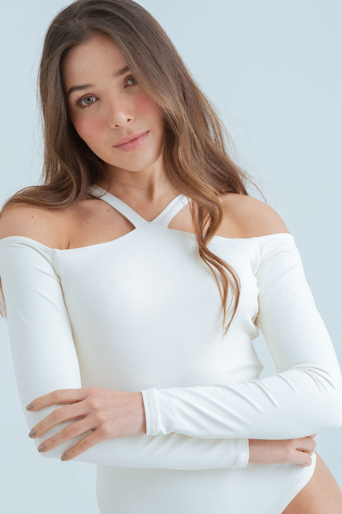 Body en tejido de punto fondo entero, escote cruzado, manga larga, broches de ajuste en la parte inferior de la tanga, silueta ajustada.