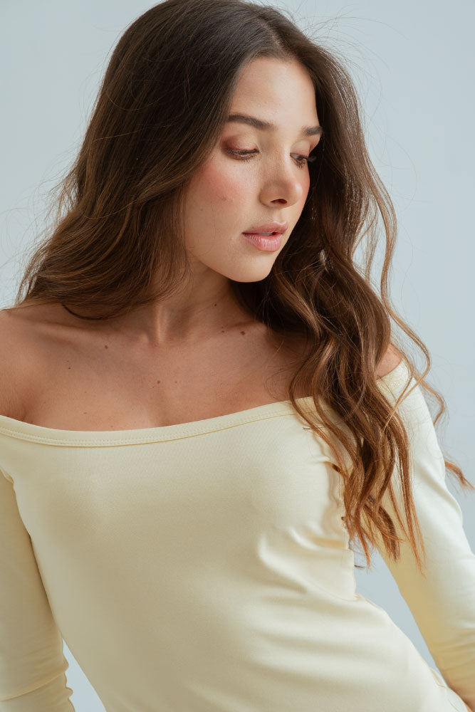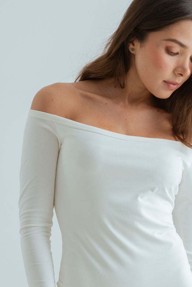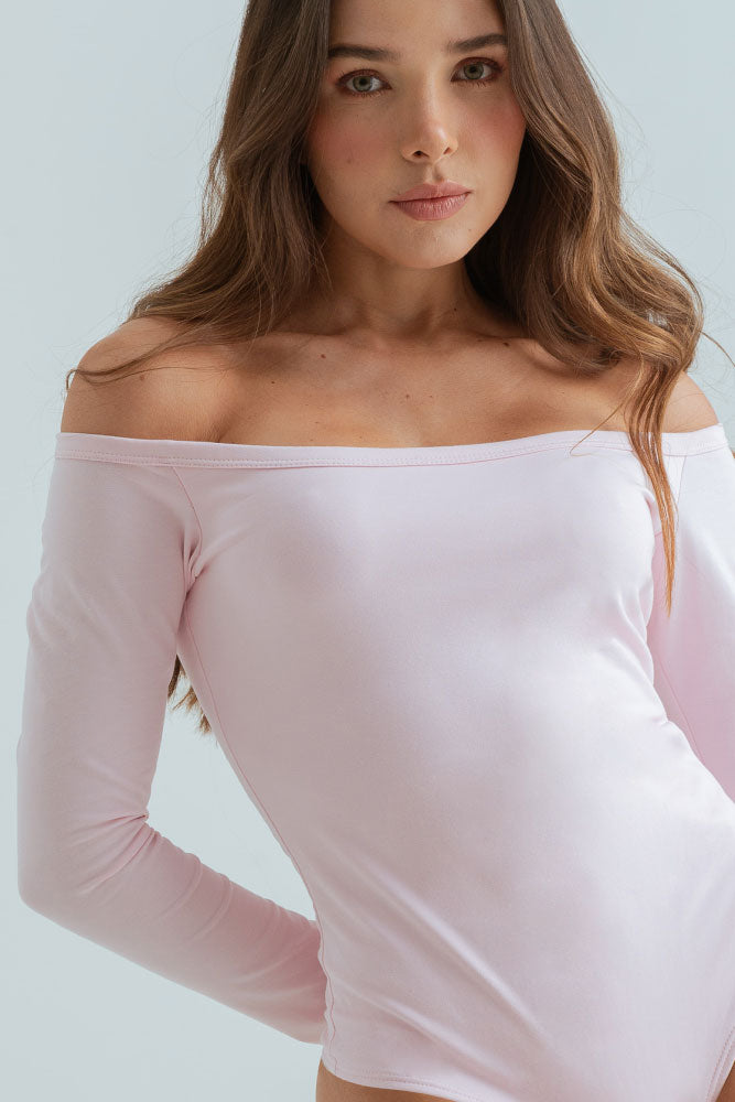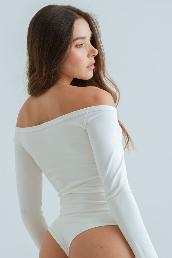 Body en tejido de punto fondo entero, escote barco, manga larga, broches de ajuste en la parte inferior de la tanga, silueta ajustada.