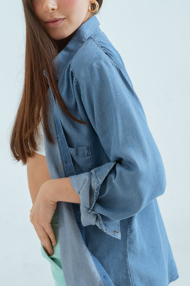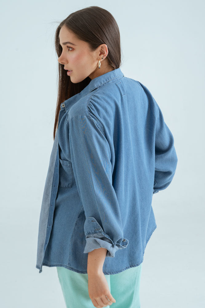 Camisa en denim 100% tencel, tono claro con manualidad, cuello y perilla completa de botones, manga larga con puño y botón, bolsillo parche en frente.