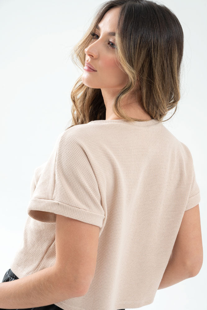 Camiseta en tejido de punto galleta, escote redondo, manga rodada con guardapolvo.