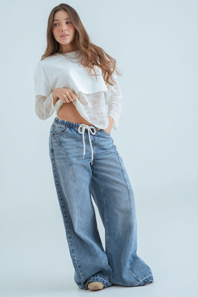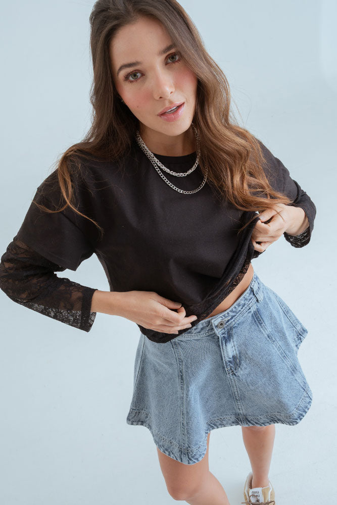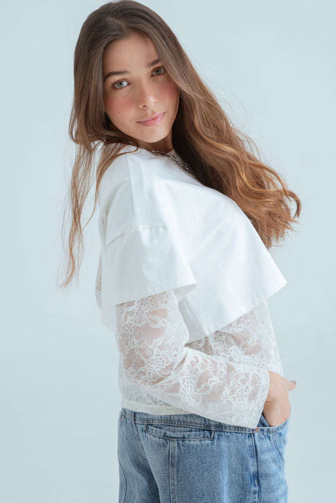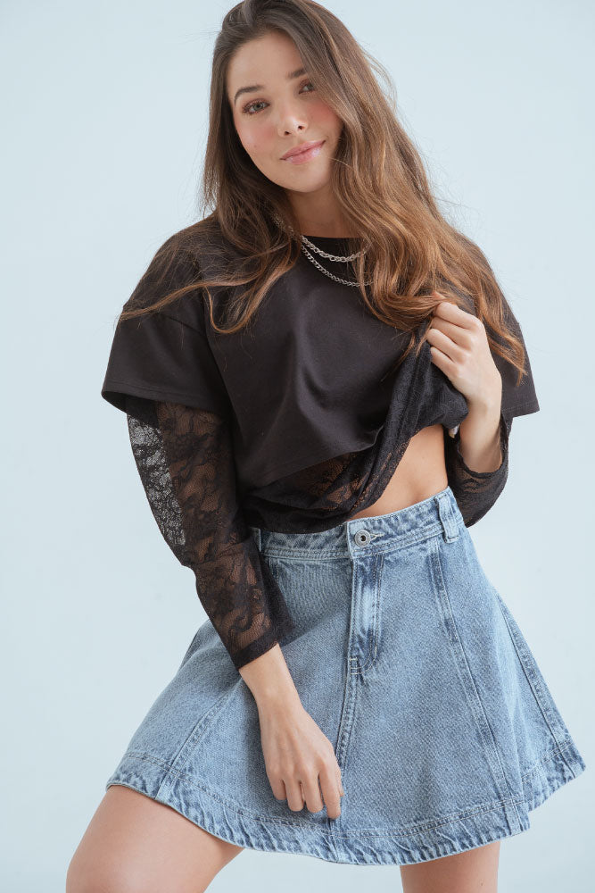 Camiseta en tejido de punto fondo entero, manga corta, cuello redondo, largo tipo crop, blusa en blonda interna, manga larga, cuello redondo.