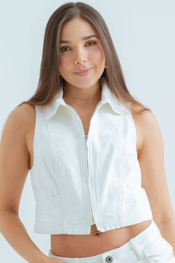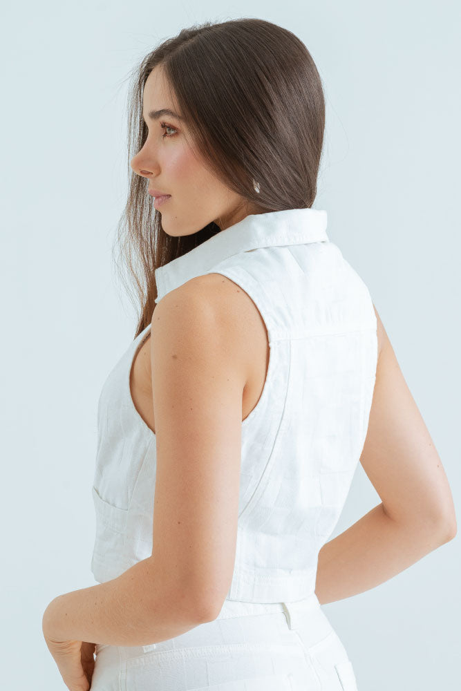 Chaleco en denim 100% algodón jacquard, cuello y cierre en frente, manga sisa.