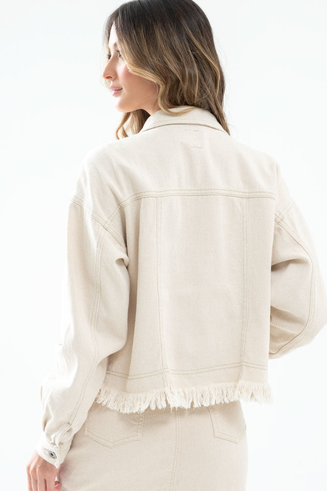 Chaqueta en denim natural fondo entero, cuello camisero, perilla completa con botones, manga larga con botón en puño, corte en frente y espalda, bolsillos en frente, detalle de flecos en ruedo.