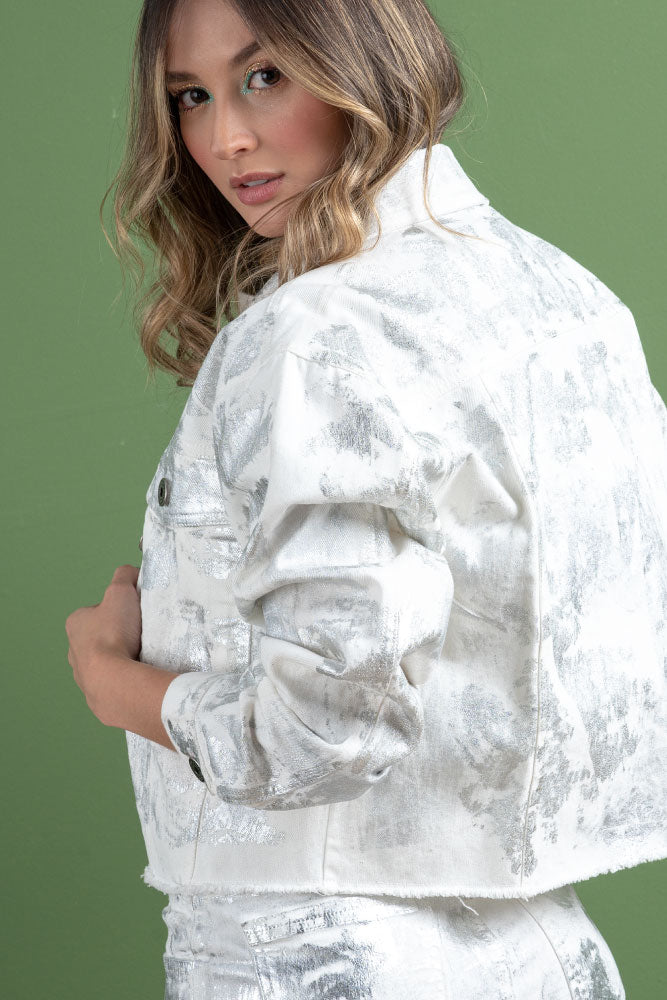 Chaqueta en denim 100% algodón, efecto foil plata, cuello y perilla completa de botones, bolsillo parche con tapa en frente, manga larga con puño y botón, ruedo al corte deshilachado.
