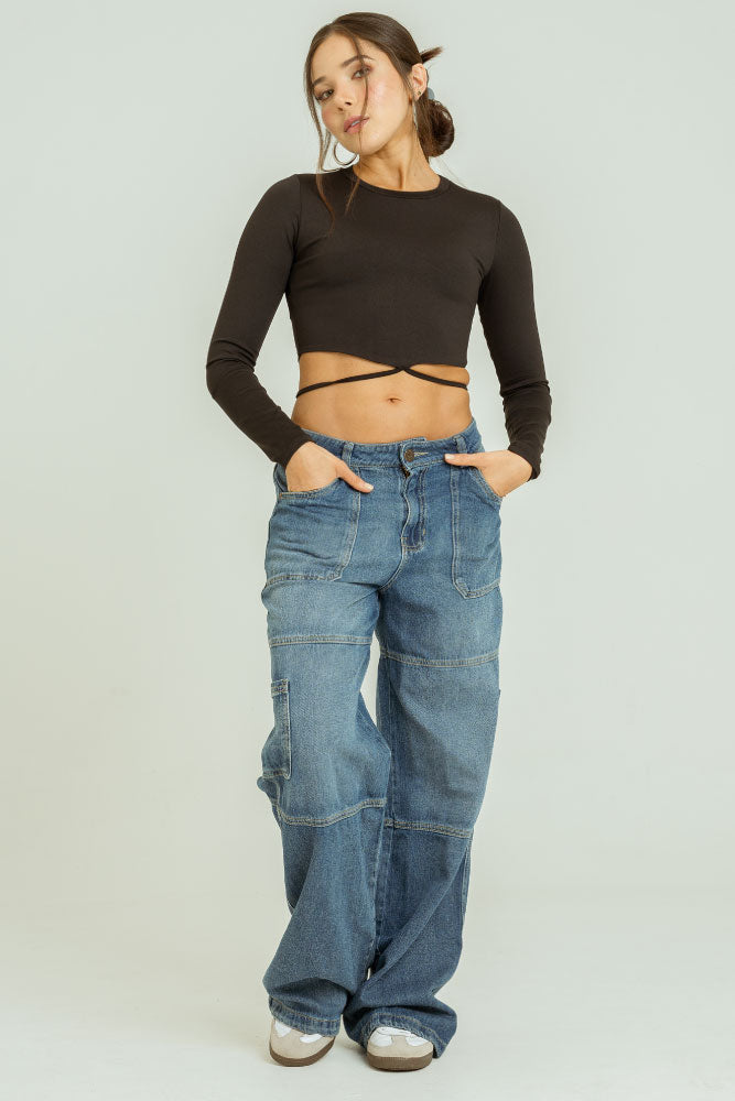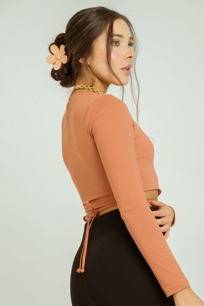Crop top en tejido de punto fondo entero, cuello redondo de 2cms, manga larga, en centro frente del ruedo salen dos sesgos de 1cm que se entrecruzan entre cintura y espalda, silueta ajustada.