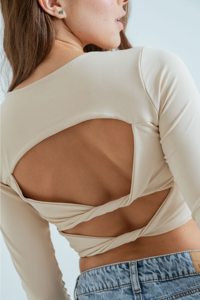 Crop top en tejido de punto fondo entero, escote redondo con falso, largo crop top, manga larga, piezas entorchadas en espalda, silueta ajustada.