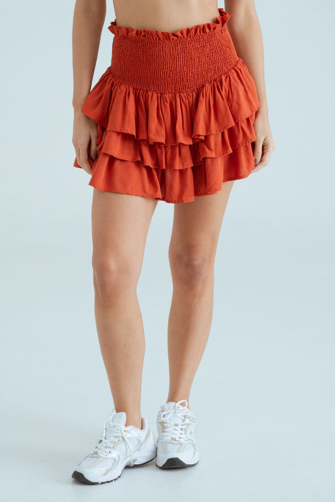 Falda corta en chalis con dobby, pretina resortada, doble capa.