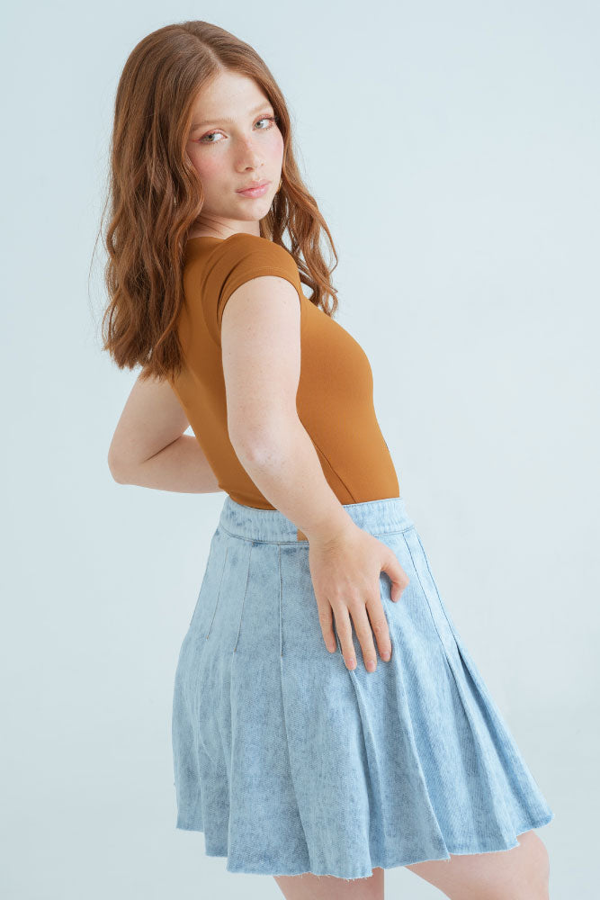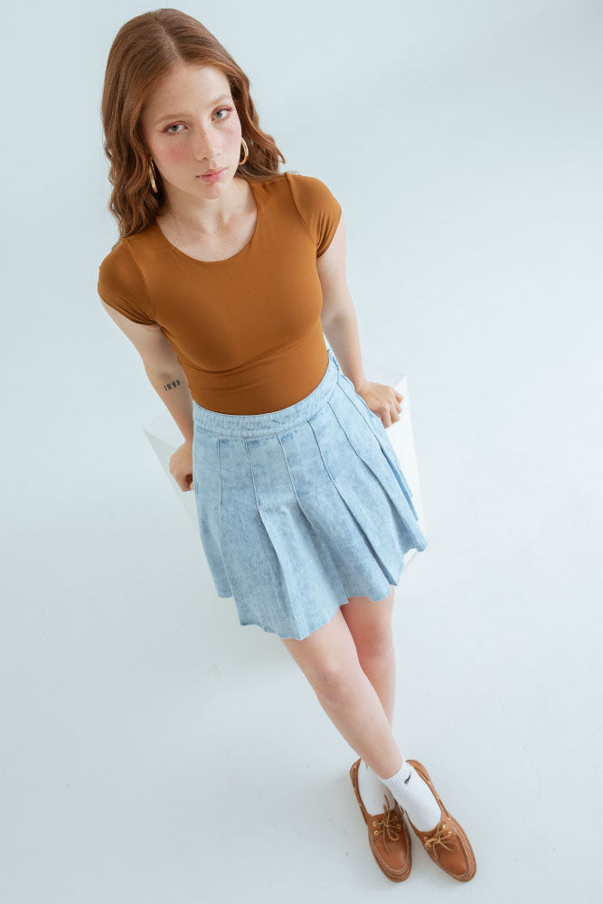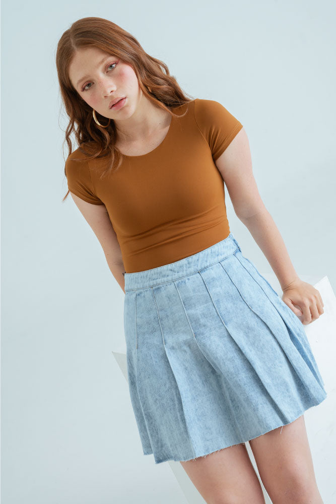 Falda corta en denim fondo entero tono claro, cierre en costado, tiro medio alto, detalle de tablas y ruedo al corte.