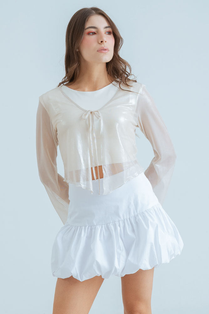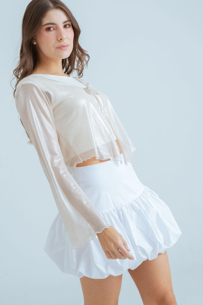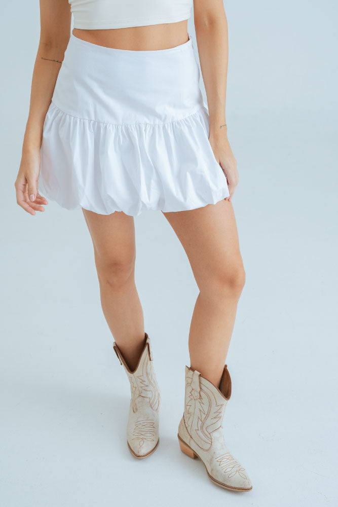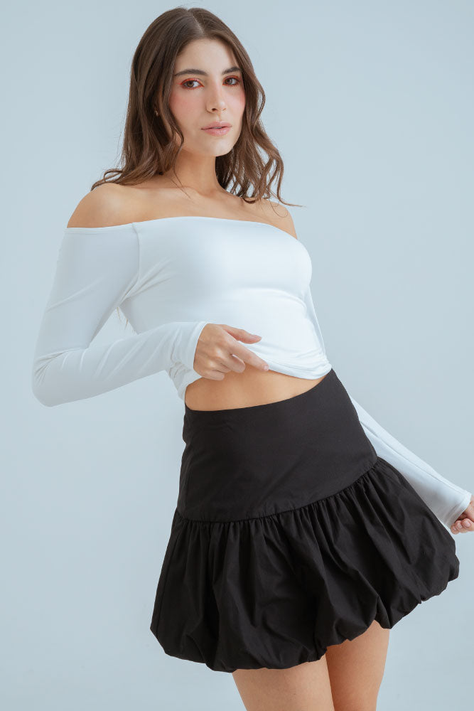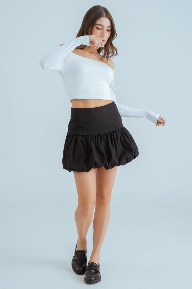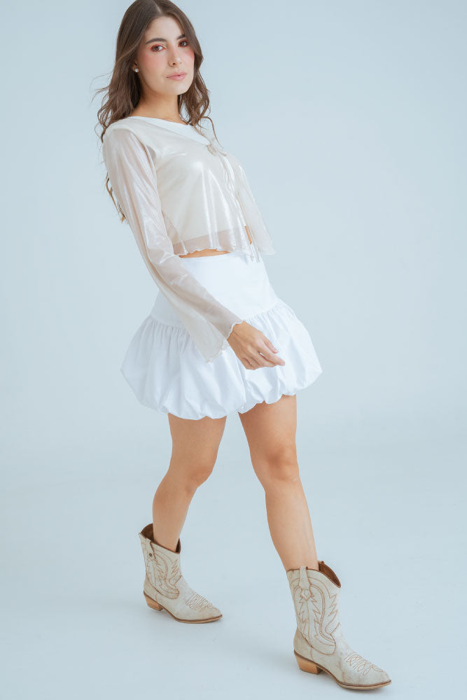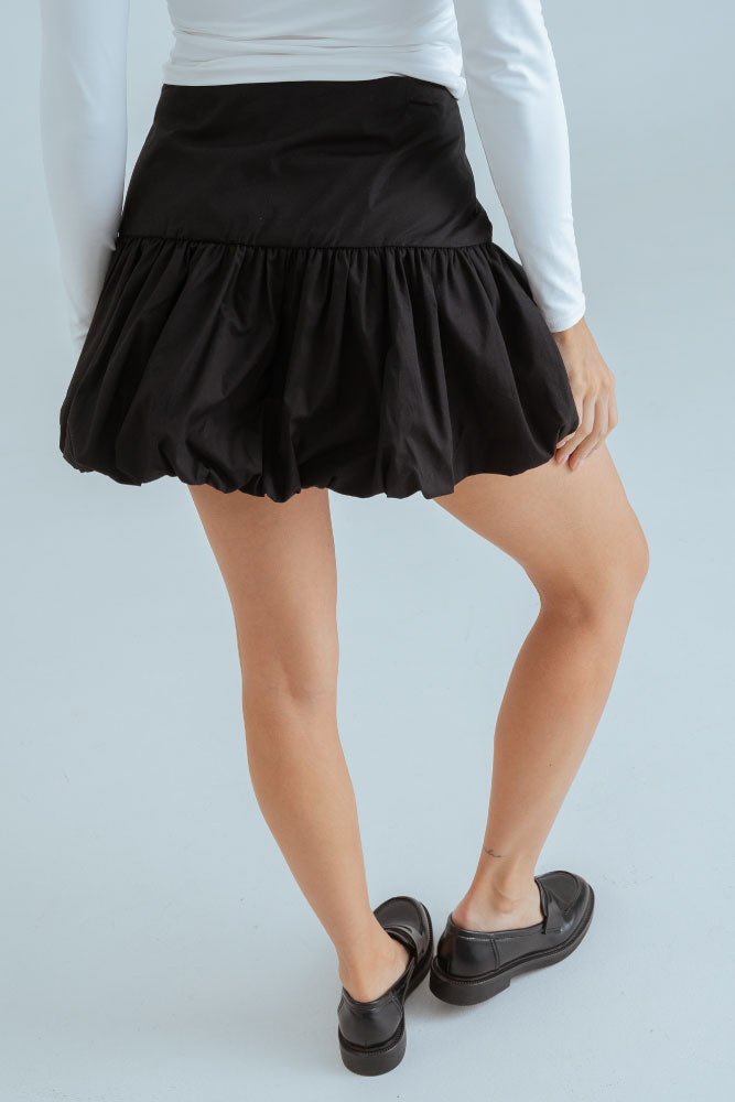 Falda corta globo en popelina, tiro alto con ajuste de cierre lateral.