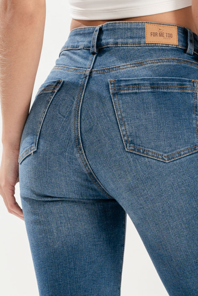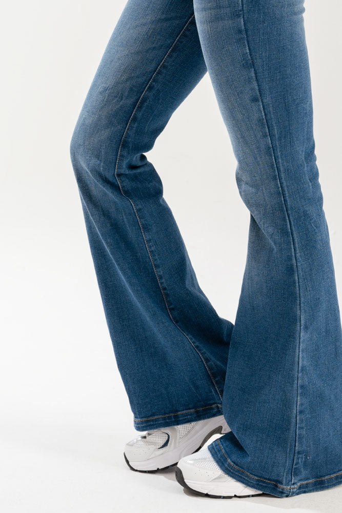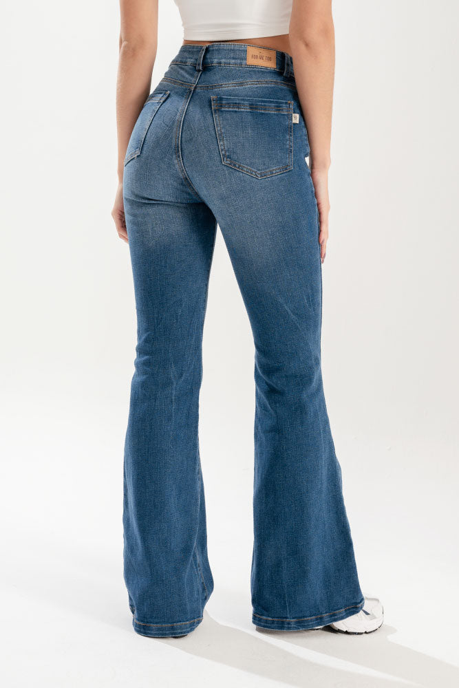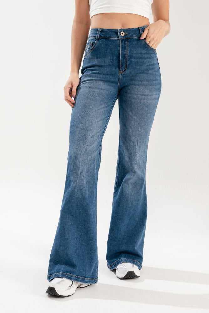 Jeans flare stretch fondo entero con proceso de manualidad, cinco bolsillos, botón y pasadores en pretina, cierre frontal, tiro alto, bota campana.