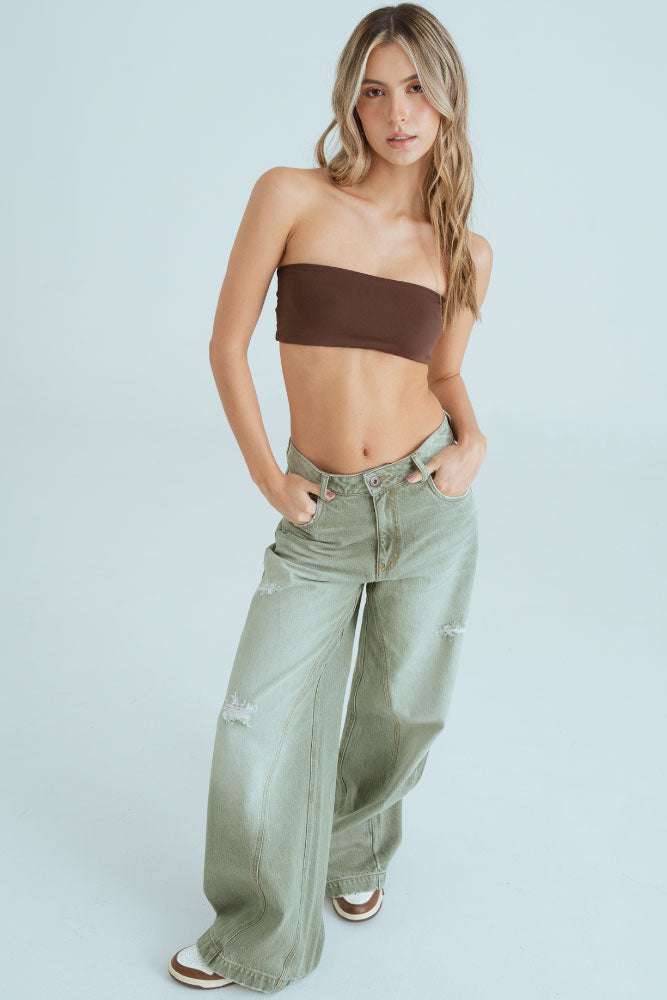 Jeans en denim rÃgido 100% algodón , color verde con proceso de lavanderÃa, tiro alto, cinco bolsillos, detalle de corte en pierna, bota ancha.