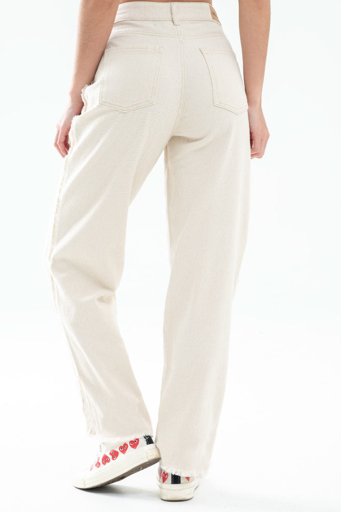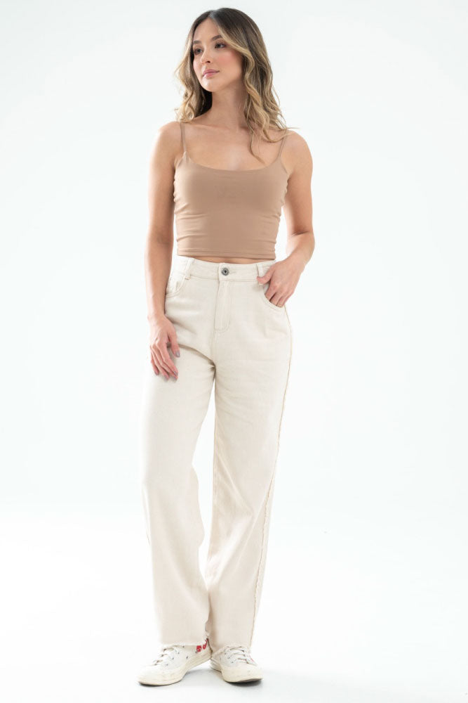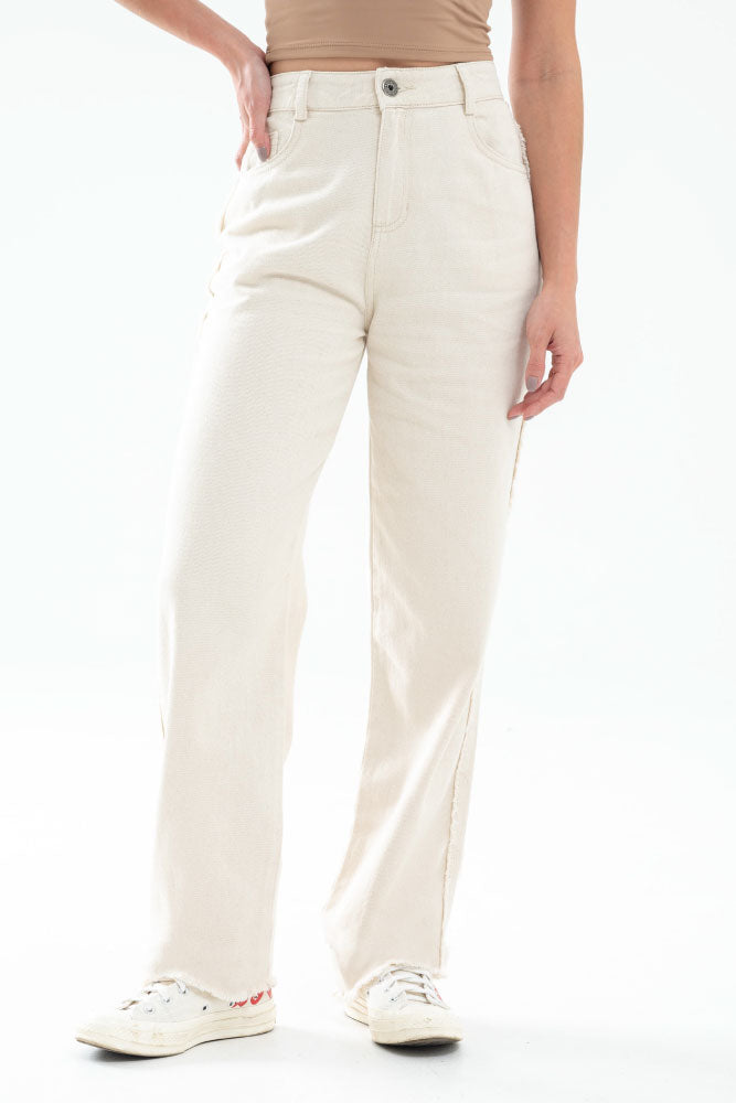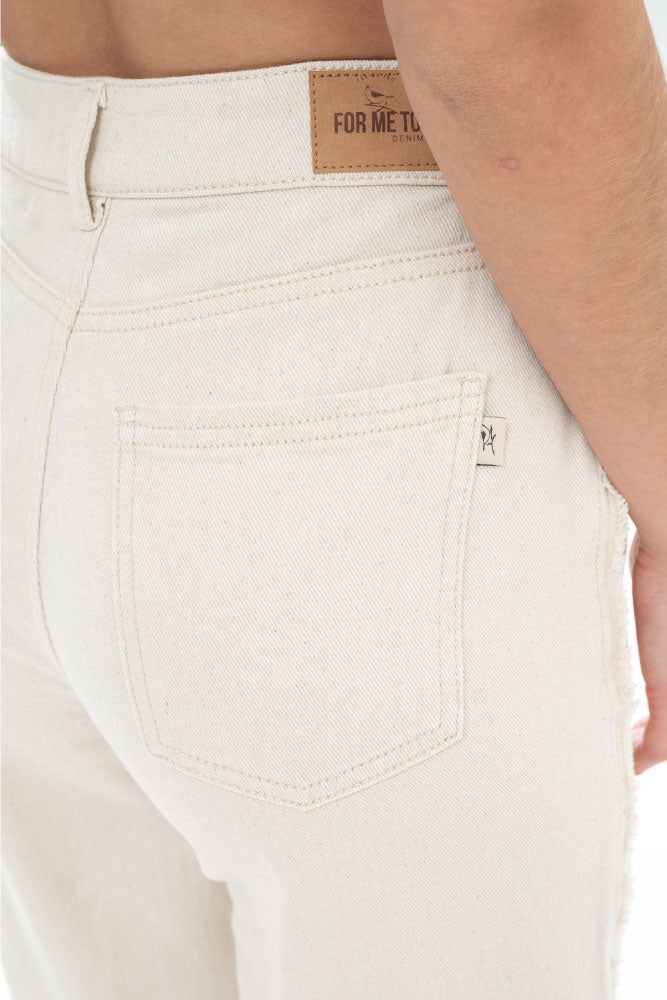 Jeans en denim natural fondo entero, pasadores y botón en pretina, cierre frontal, tiro alto, cinco bolsillos, bota recta con flecos en ruedo.