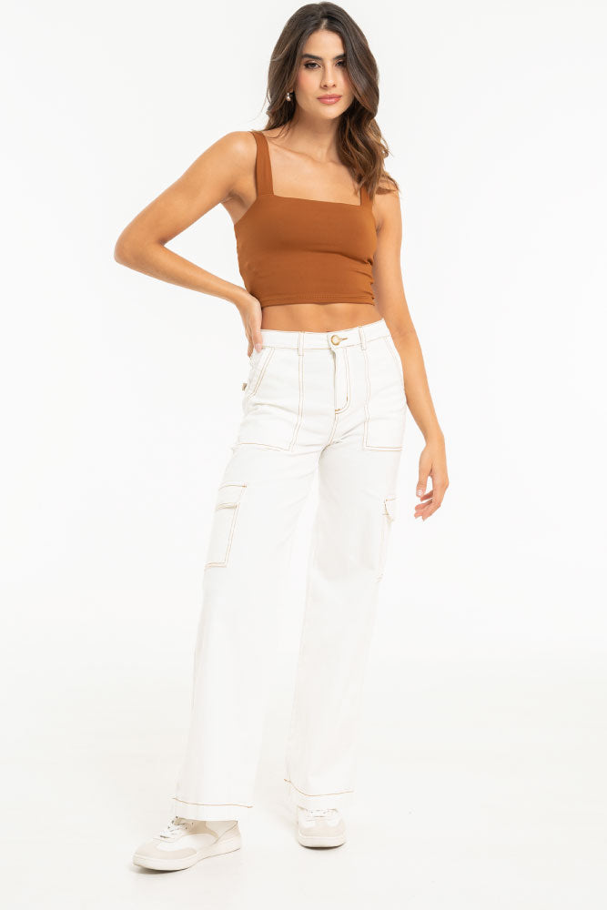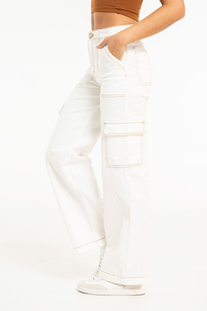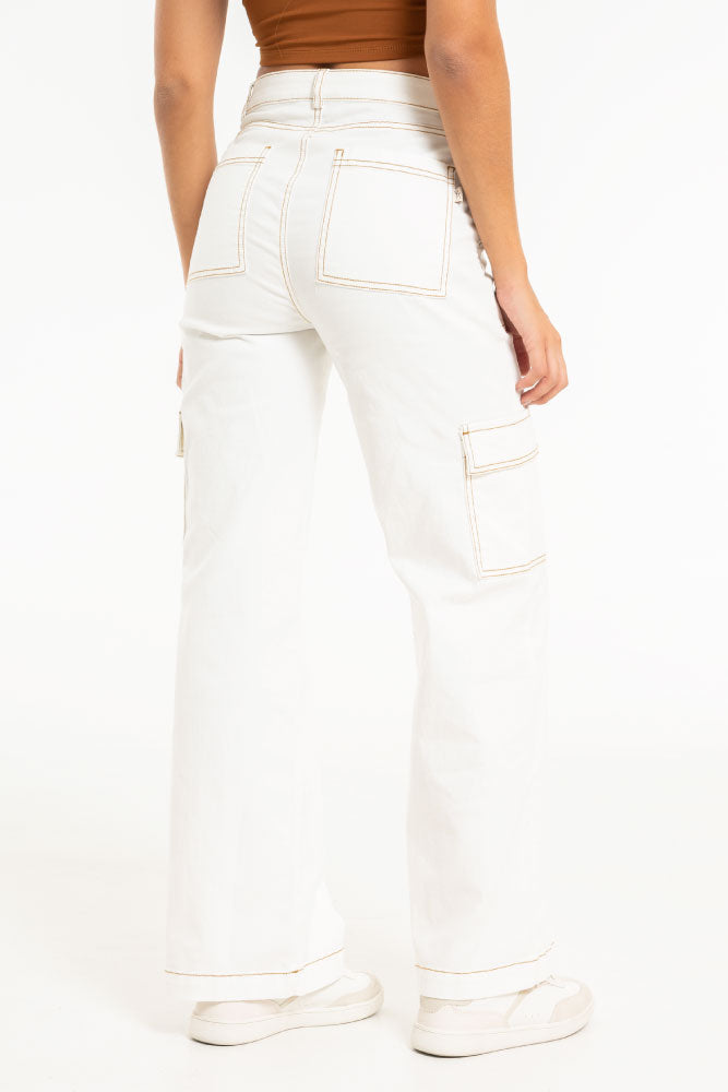 Pantalón en dril fondo entero, pasadores y botón en pretina, cierre frontal, tiro alto, bolsillos parche en delantero y en posterior, detalle de bolsillos con tapa en costados.
