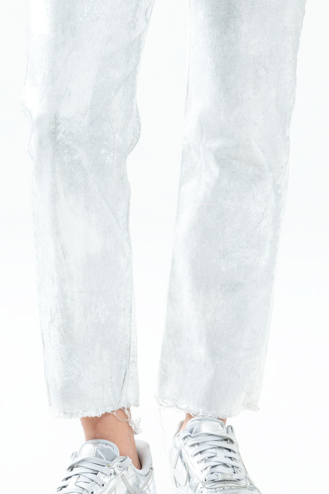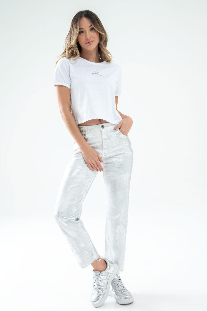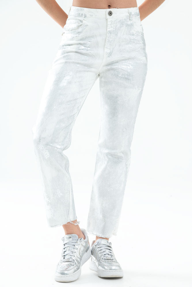 Pantalón en denim , tiro alto, efecto foil plata, cinco bolsillos, cierre frontal y botón, ruedo al corte.