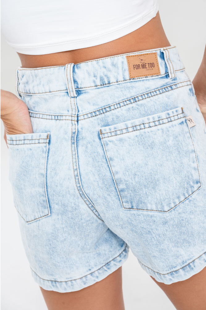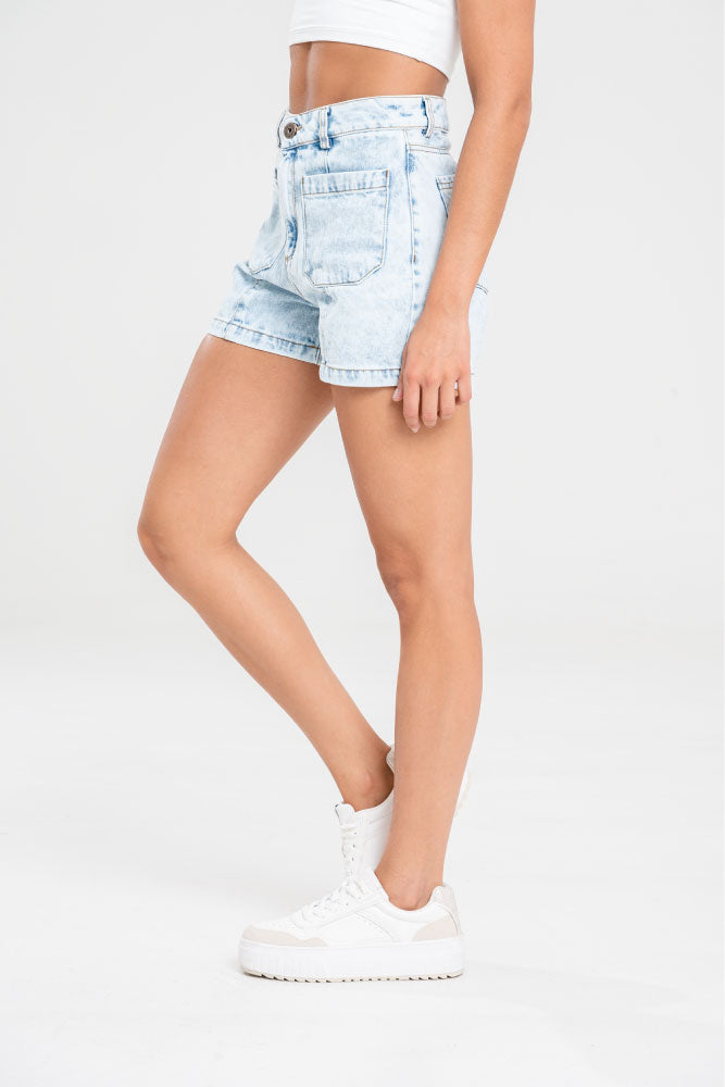 Short en denim rigido, tiro alto, tono claro con manualidad, bolsillo parche en frente y posterior.
