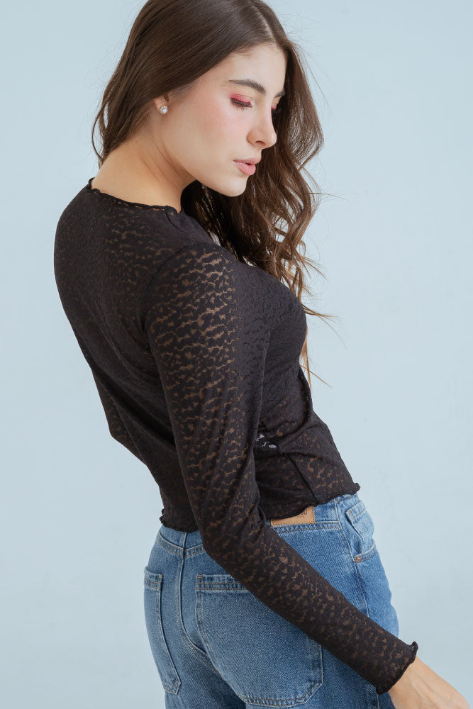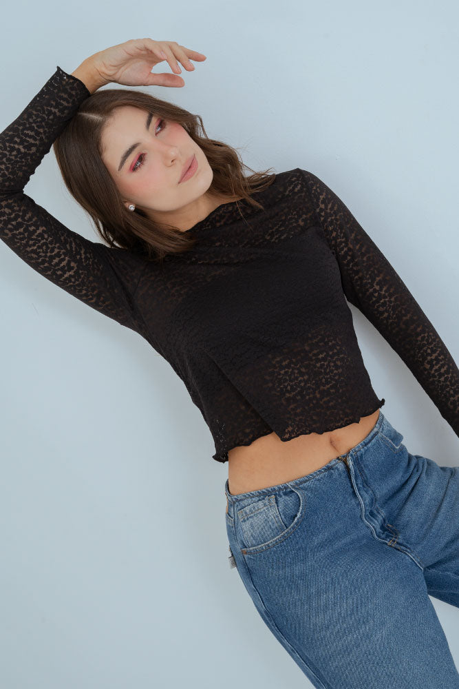 Blusa en blonda fondo entero, escote alto redondo, manga larga.