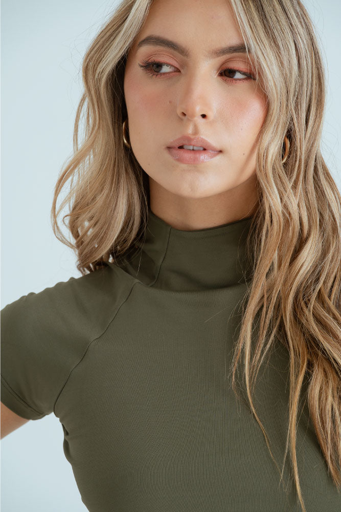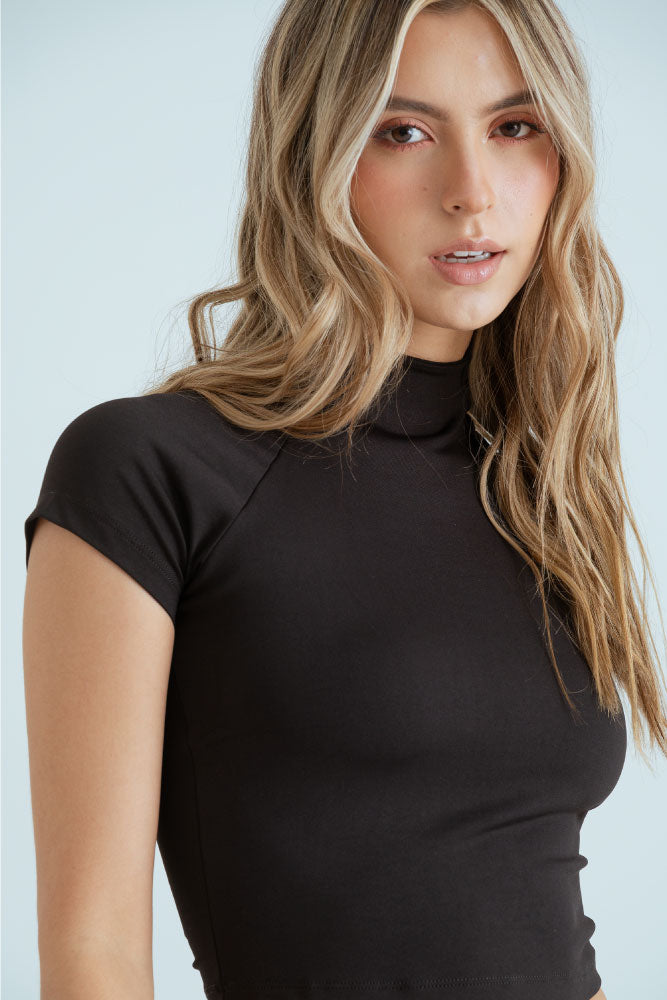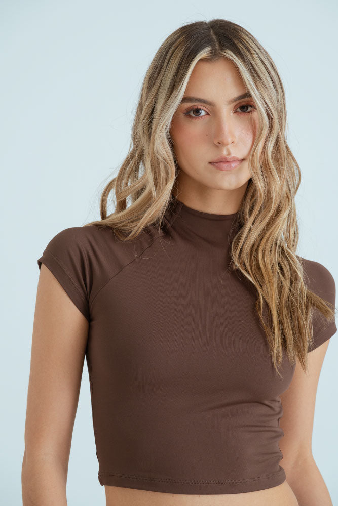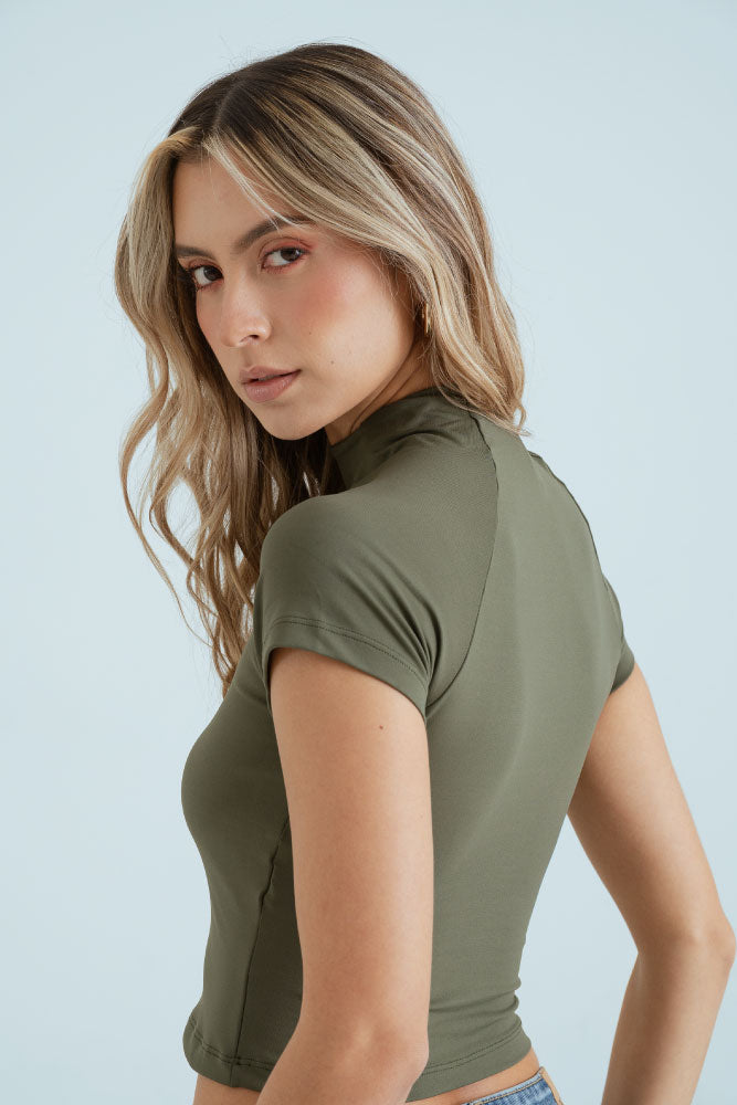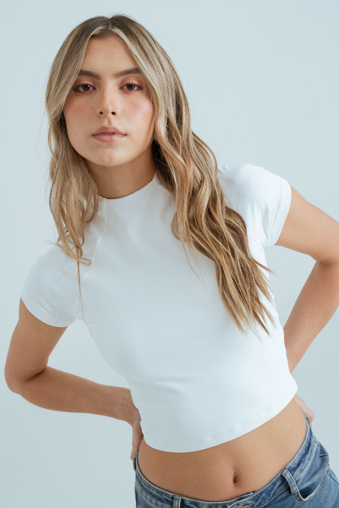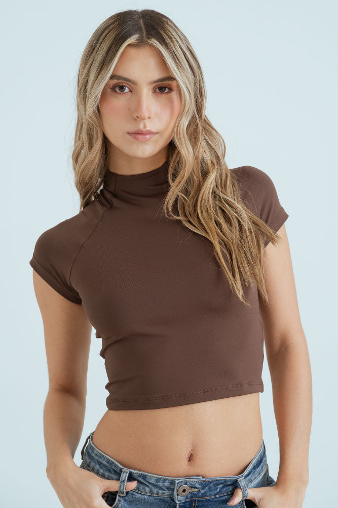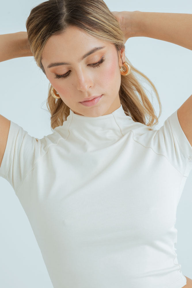 Top en tejido de punto microfibra fondo entero, escote alto redondo, manga corta.