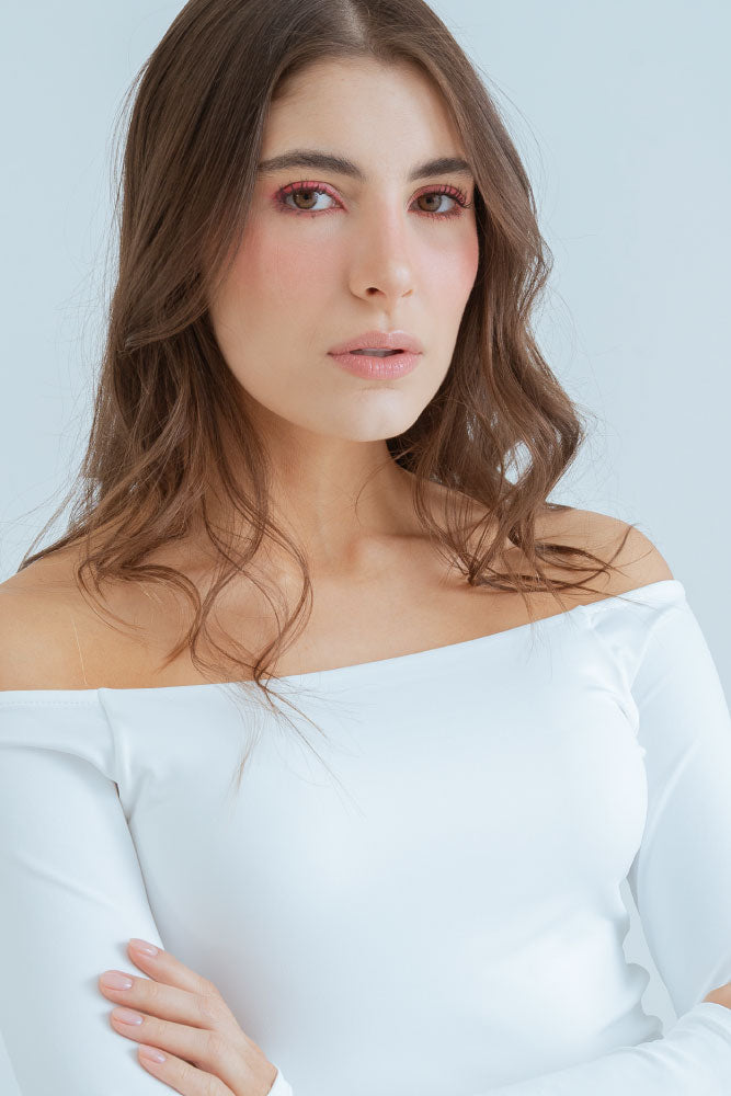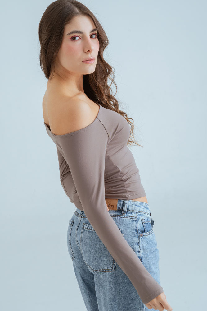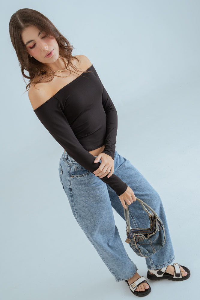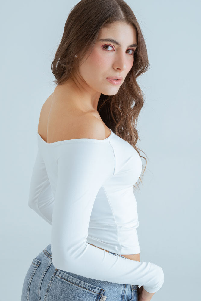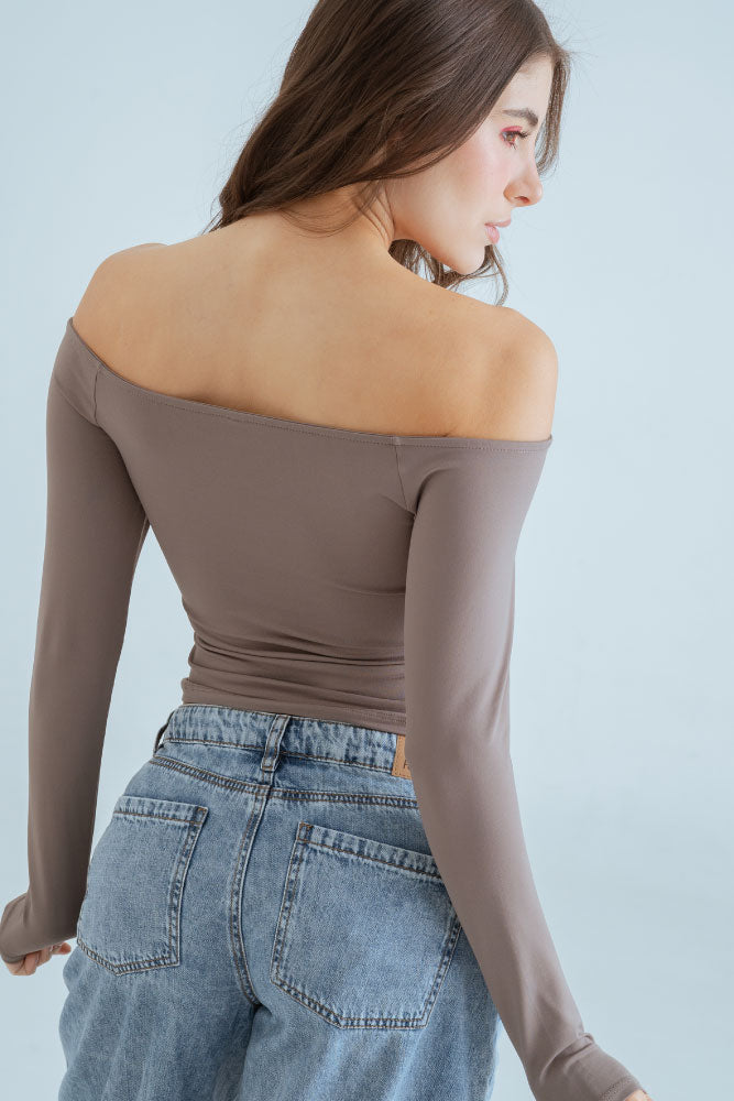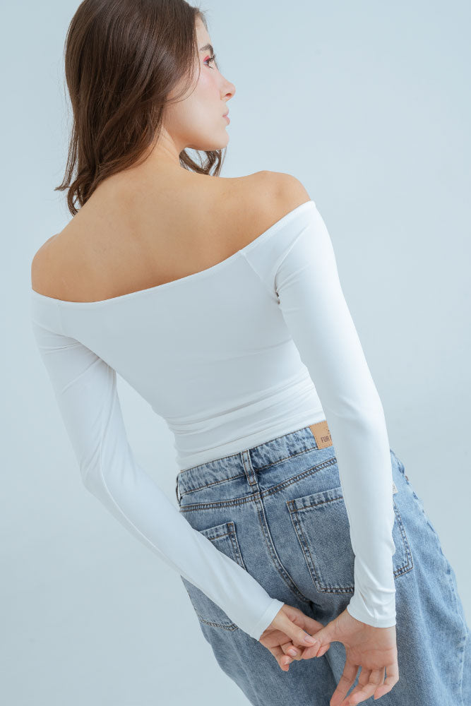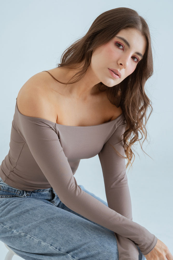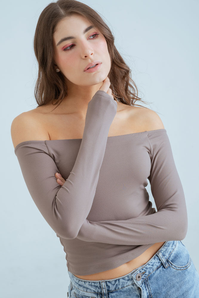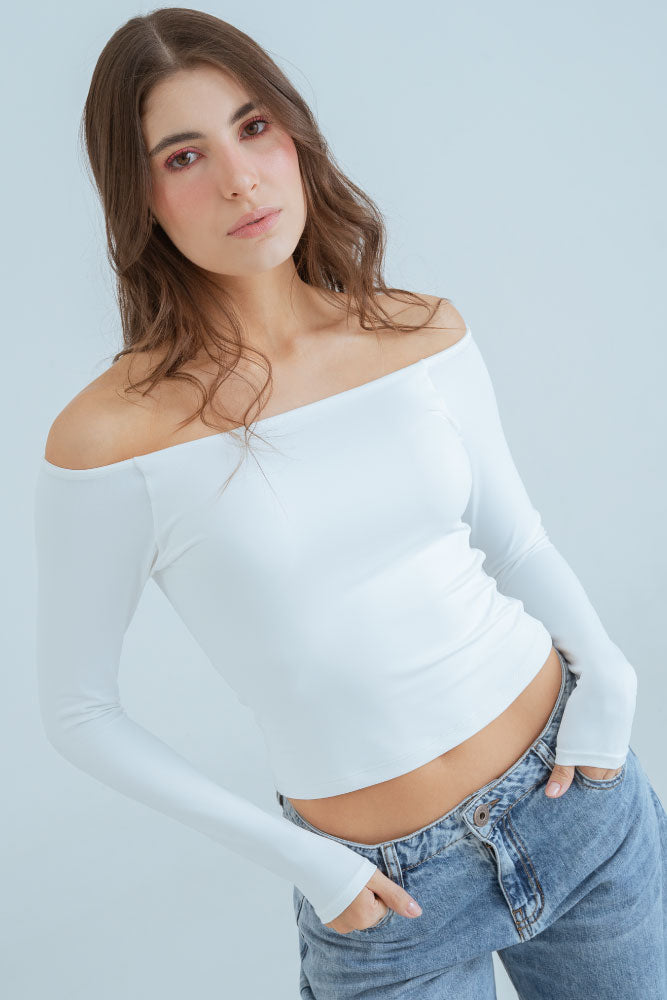 Top largo en tejido de punto fondo entero, escote bandeja, manga larga, silueta ajustada.