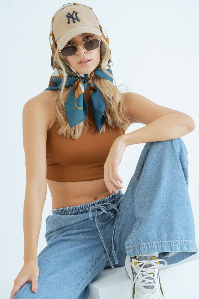 Top en tejido de punto penelope, de tiras anchas para amarre en espalda, escote recto, silueta ajustada.