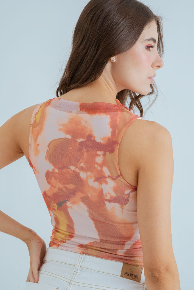 Top en mesh estampado, forrado en penelope, hombro, sisa y costado con drapeado asimétrico, silueta ajustada.