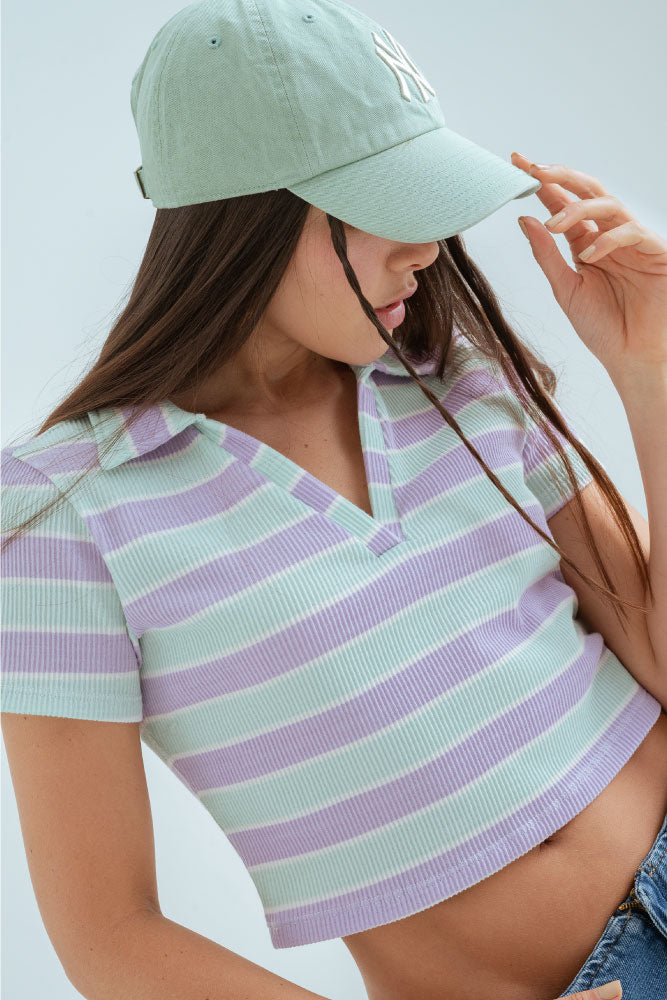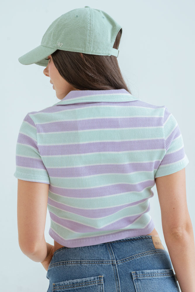 Top en tejido de punto rib a rayas, con cuello y media perilla tipo polo, manga corta, silueta ajustada.